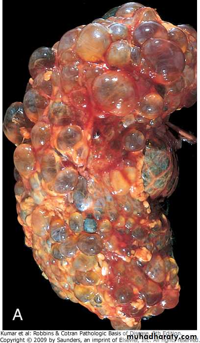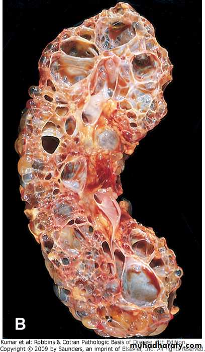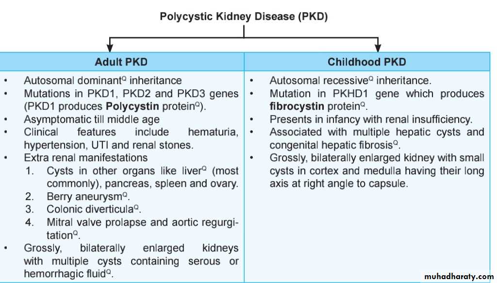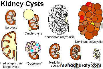 3.polycystic kidney disease a. Autosomal dominant (adult) type. b. Autosomal recessive (childhood) type.4.Medullary cystic disease. a. Medullary sponge kidney. b. Nephronophthisis.
