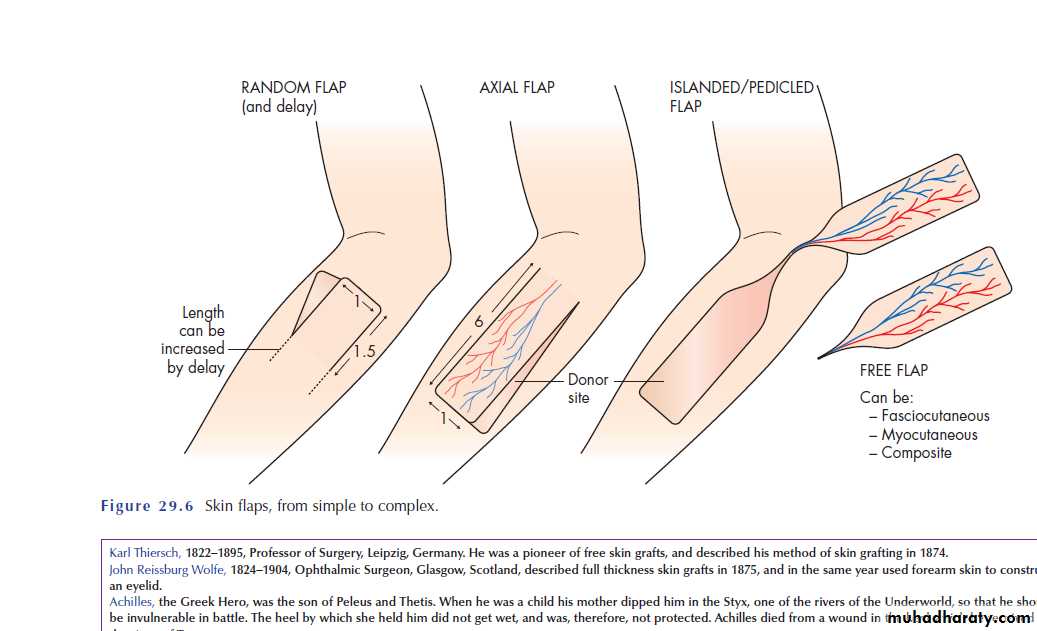2-Axial flaps :much longer based on known blood vessels supplying the skin , enable many long thin Flap to be safely moved across long distance