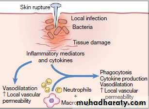 pro-inflammatory cytokines produced at the site of injury have profound systemic effects. IL-1, TNF-α and IL-6 act on the hypothalamus to raise the temperature set-point, causing fever,