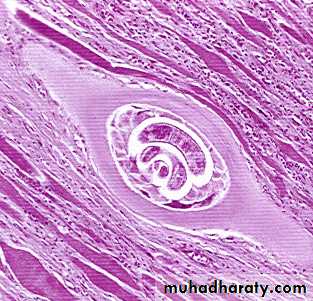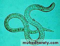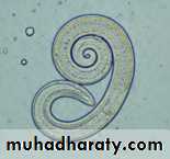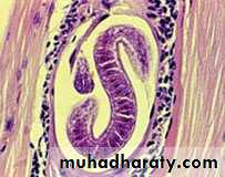 C, D: Larvae of Trichinella, freed from their cysts, typically coiled; length: 0.8 to 1 mm.