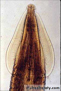 Both males and females taper at the anterior end. Males are 1.4 to 1.6 mm long and females are about twice that length.