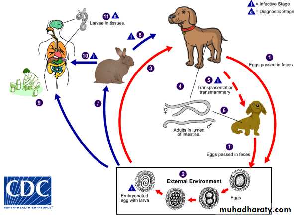 (dog roundworm) and less frequently of T. cati(cat roundworm), two nematode parasites of animals.