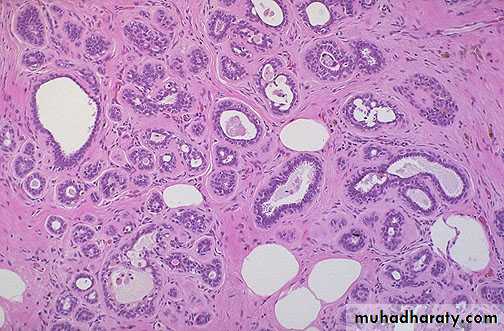 • c. Adenosis : There is formation of new breast lobules as a result of proliferation of the breast epithelium of ducts & acini. There may be increase in the fibrous stroma producing distortion of the acinar pattern & eventually sclerosis . This is called sclerosing adenosis .
