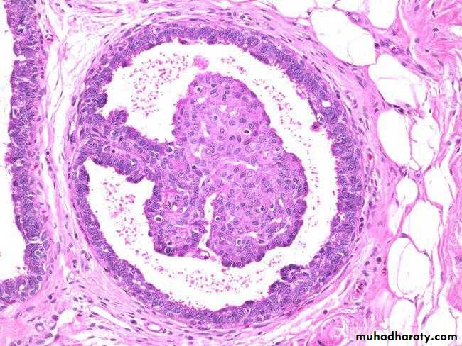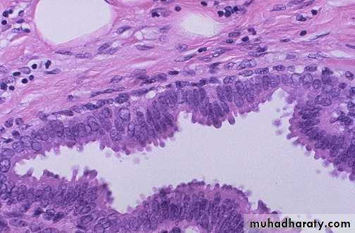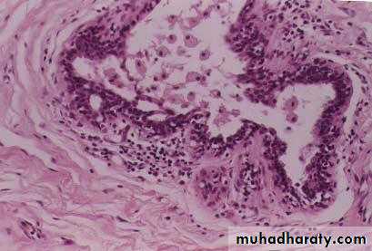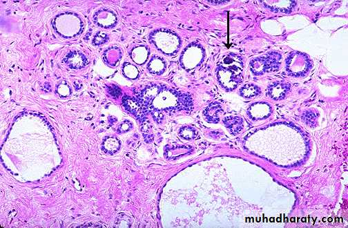 • The essential feature is increase in the thickness of the epithelium of the wall of ducts & acini due to hyperplasia of the epithelium of ducts & acini . Thus the cells are several layers in depth & the lumen may be completely obliterated by this proliferation .• Proliferative Breast Diseases With Atypia