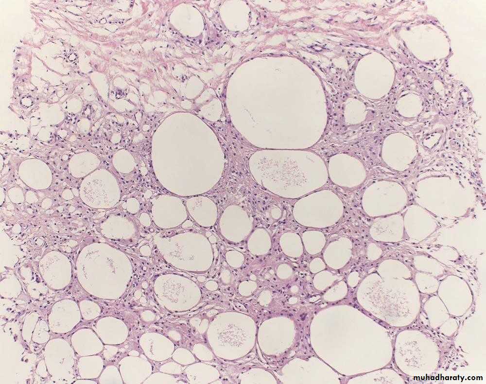 • Microscopically: necrotic fatty cells surrounded by neutrophils, lymphocytes, plasma cells and lipid filled macrophages, enclosed by fibrous tissue.
