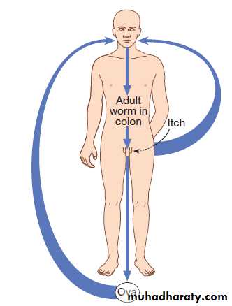The gravid female worm lays ova around the anus, causing intense itching, especially at night.The ova are often carried to the mouth on the fingers and so re-infection or human-to-human infection takes place