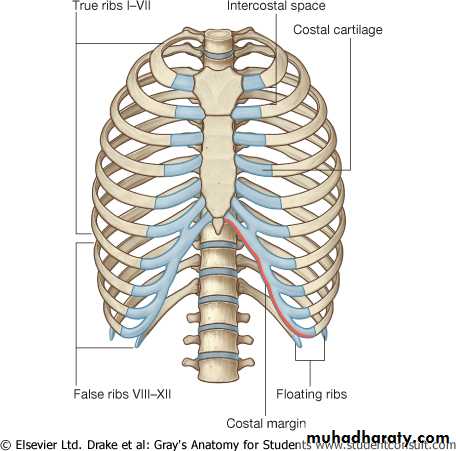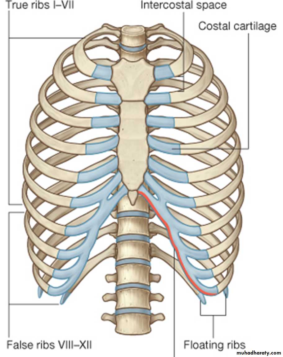 Floating ribs: The 11th and 12th pairs have no anterior attachment.