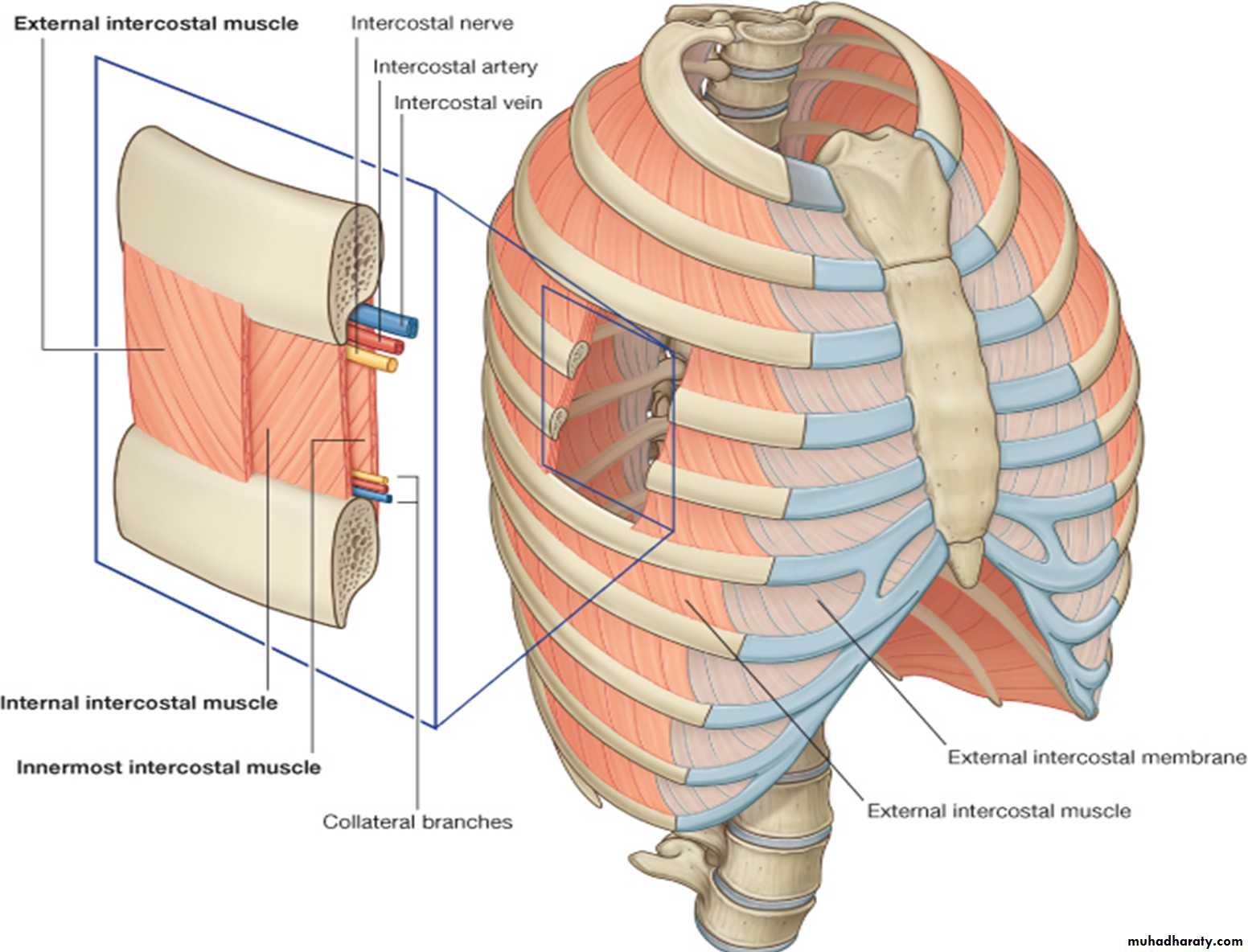 The muscle extends forward to the costal cartilage where it is replaced by an aponeurosis, which is named as the anterior (external) intercostal membrane