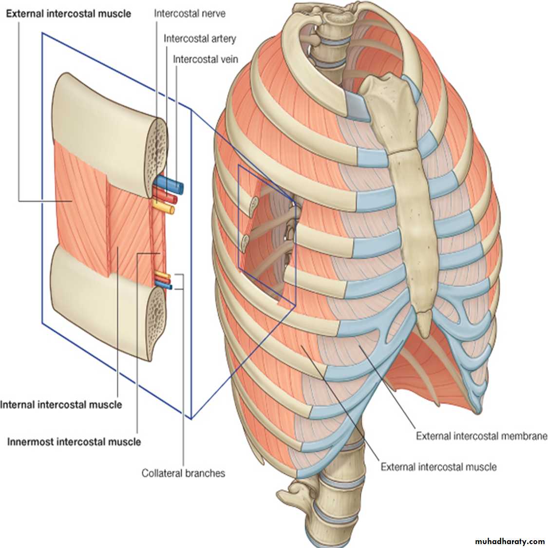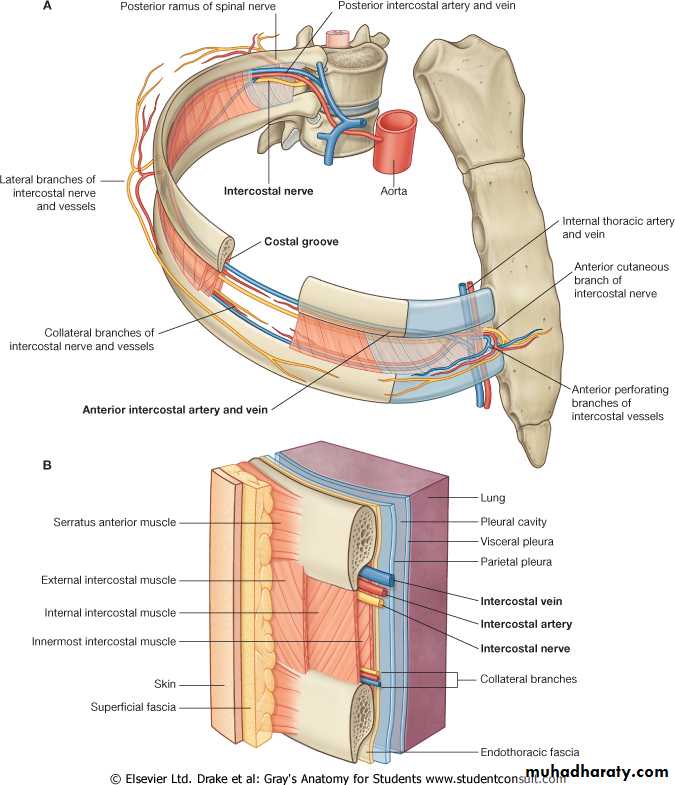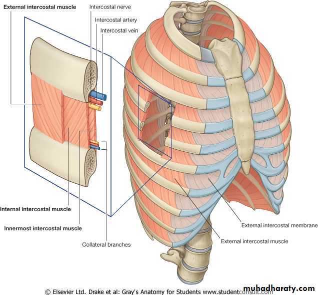 The spaces between the ribs contain three muscles of respiration:The external intercostal m.