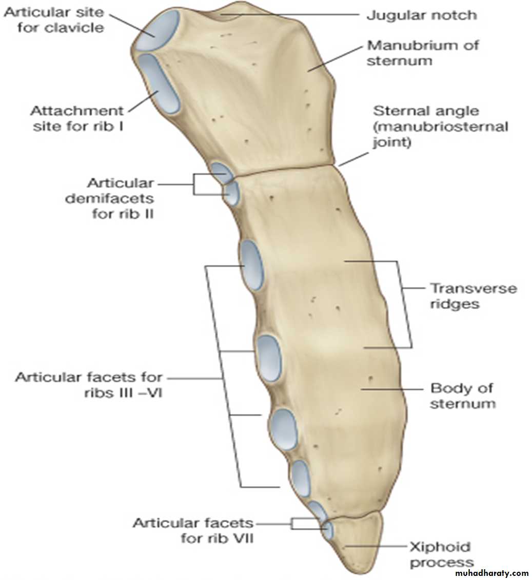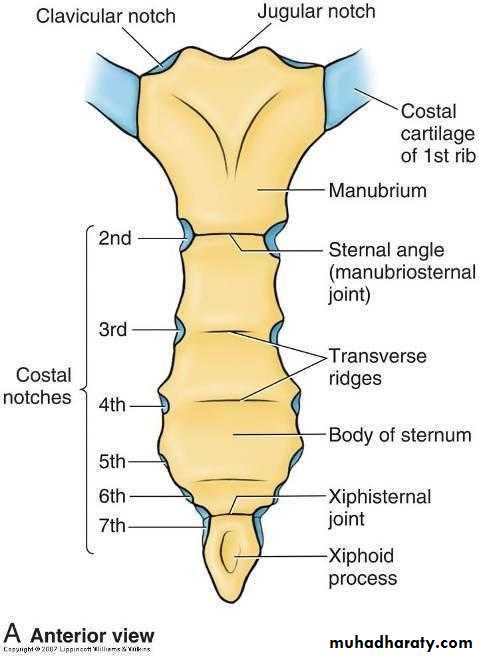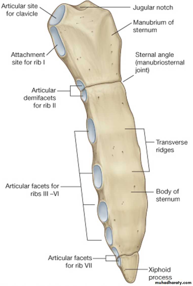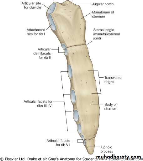 The manubrium is the upper part of the sternum. It articulates with the body of the sternum at the manubriosternal joint, and it also articulates with the clavicles and with the1st costal cartilage and the upper part of the 2nd costal cartilages on each side. It lies opposite T3&T4