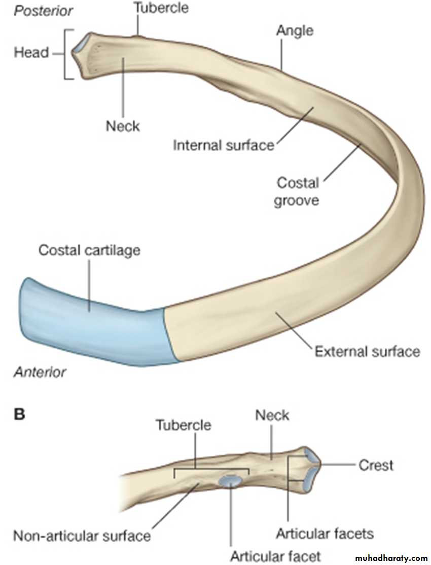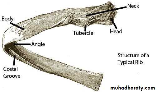 A typical rib is a long, twisted, flat bone having a rounded, smooth superior border and a sharp, thin inferior border. The inferior border overhangs and forms the costal groove, which accommodates the intercostal vessels and nerve.A rib has a head, neck, tubercle, shaft, and angle. The head has two facets for articulation with the numerically corresponding vertebral body and that of the vertebra above.