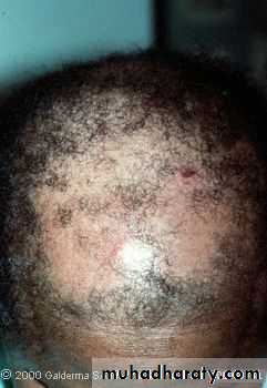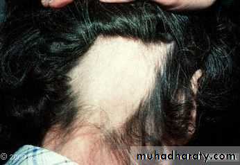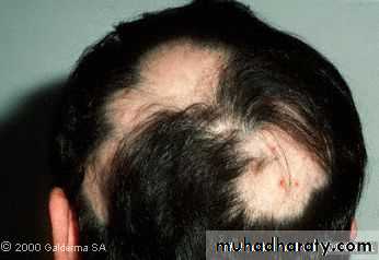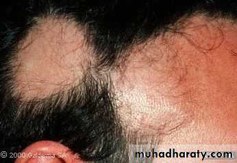 Alopecia areata is characterized by rapid and complete loss of hair in one or more round or oval patches, usually in the scalp, beard area, eyebrows, eyelashes and less commonly on other area. Often patches are from 1-5 cm in diameter.Alopecia totalis: is complete loss of scalp hair