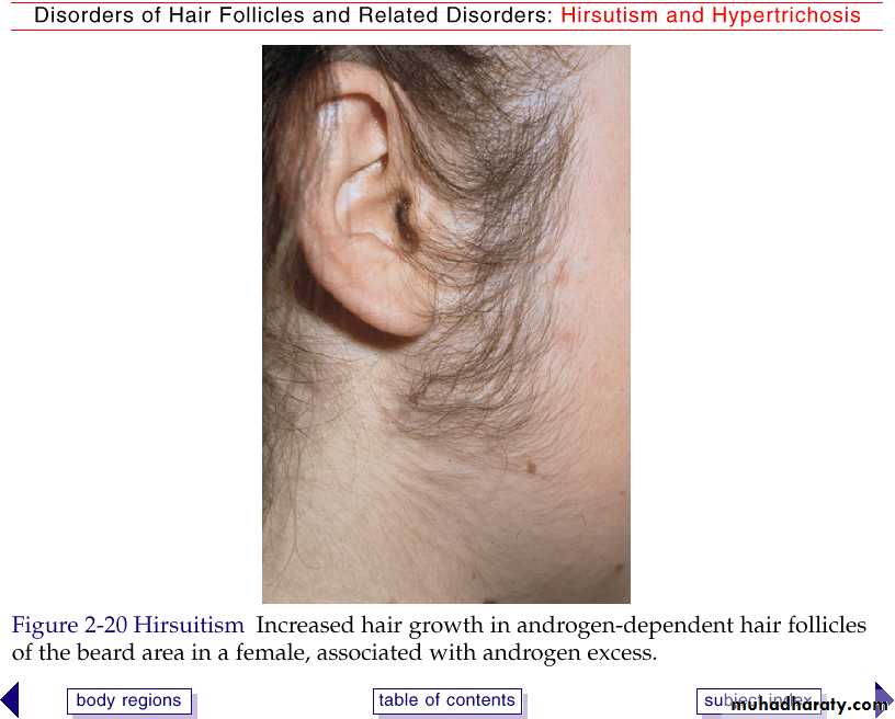 Racial variation: women of European have facial, abdominal, and thigh hair; whereas Asian and Indian have little terminal hair growth in these areas.May result either from excessive of androgens from either the ovary or the adrenal gland, or from excessive stimulation by pituitary tumors