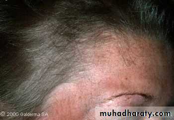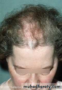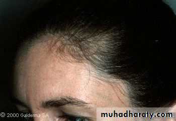 Traction alopecia occurs from prolonged tension on the hair. Most commonly involves the periphery of the scalp, especially the temples and the above the ears.