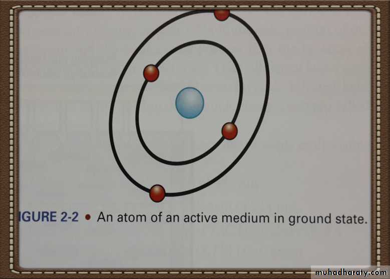 Surrounding this active medium an excitation source such as electrical circuit ,electrical coil that pumps energy into the active medium ,when this pumping mechanism pumps energy into the active medium the is absorbed by the electrons in the outer most shell of the active medium , s atoms . those electrons have absorbed a specific amount of energy to reach to the next shell farther from the nucleus , which is at a higher energy level .