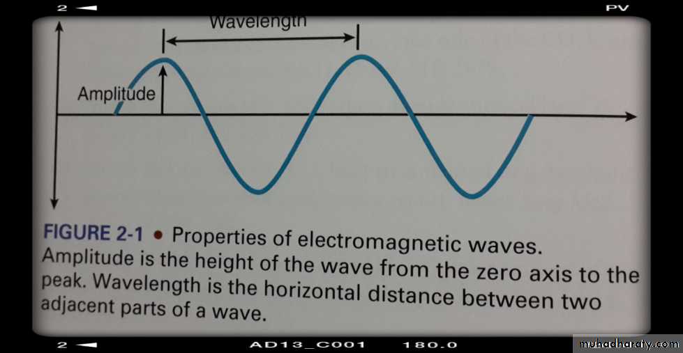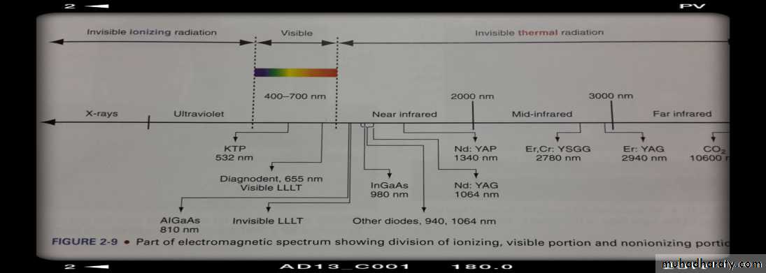 RADIATION :The electromagnetic spectrum is the entire collection of wave energy ranging from Gamma rays to Radio waves. All available dental laser devices have emission wavelengths of approximately (500nm-10600nm)which places then in the visible or invisible nonionizing portion of electromagnetic spectrum