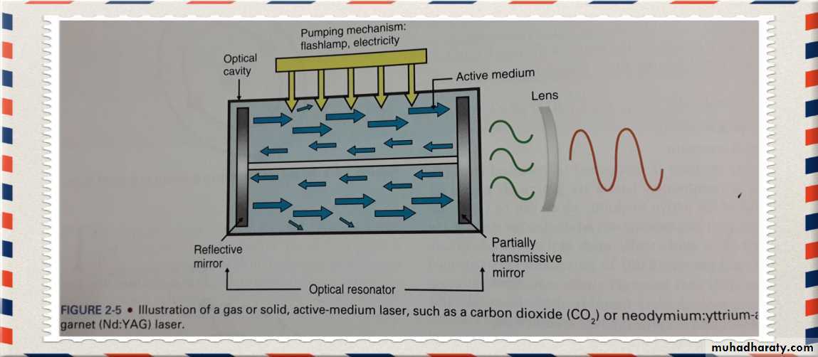 Therapeutic lasers are typically founded in the visible red to near visible infrared part of the electromagnetic spectrum (630-930)nm. Out put power typically range from (50-500)mill watts .The penetration depth vary ;laser in the red part of the spectrum are more superficially absorbed ,whereas (IR)lasers penetrate as much as (3-5)cm depending on wavelength & target tissue . Therapeutic lasers mainly affects cell in decreasing oxidation –reduction (redox) . A cell in low redox stage is acidic ,but after laser irradiation the cell becomes more alkaline & able to perform optimally .The most essential effect may be the increase of adenosine triphosphate .
