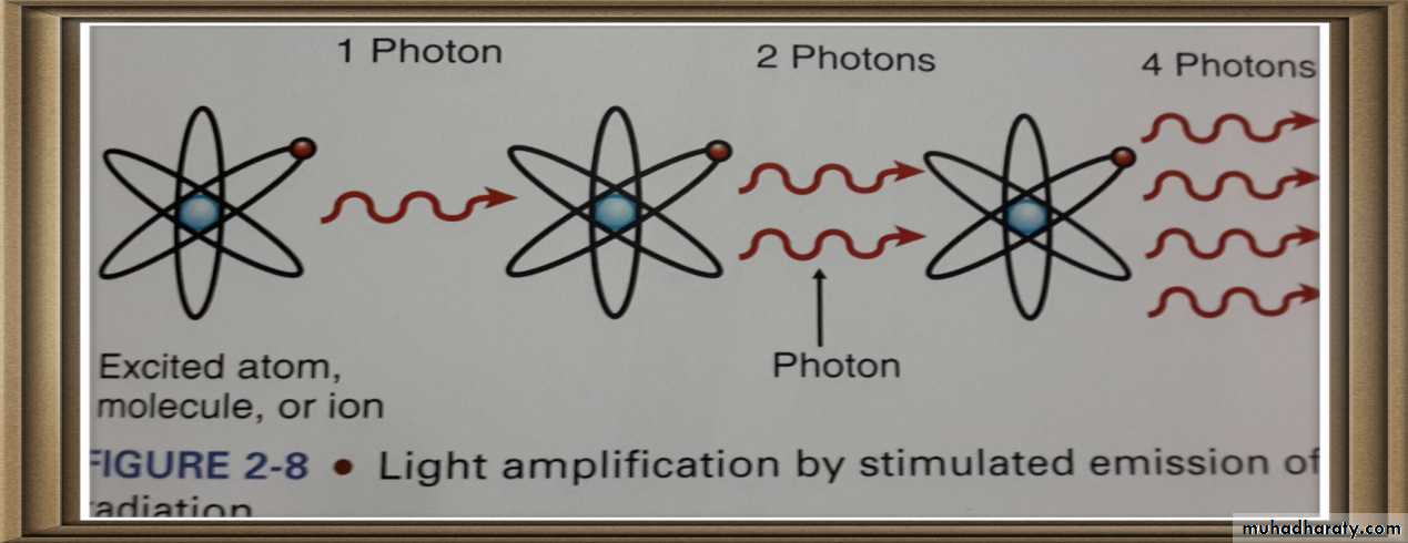 The word laser is an acronym for light amplification by stimulated emission of radiation . A brief description of these five terms helps explain the unique qualities of a laser instrument.LIGHT : Is a form of electromagnetic energy that exists as a particle (photon) & that travels in waves at a constant velocity . the waves of photon travel can be defined by two basic properties :
