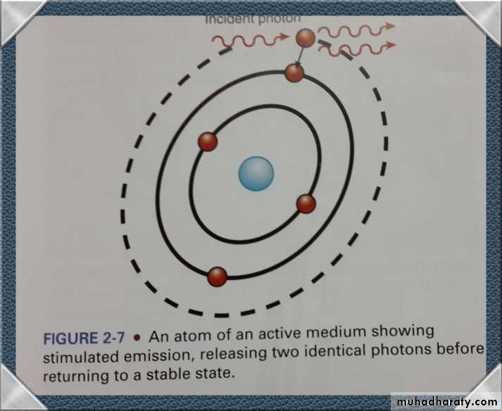 Is the process by which laser beam are produced inside the laser cavity .The theory of stimulated emission was postulated by Albert Enstien in 1916 . This energy is emitted or radiated as identical photons , traveling as coherent wave. These photons in turn are then able to energize more atoms in a geometric progression , which further causes the emission of additional photons ,resulting in an amplification of the light energy , thus producing a laser beam.