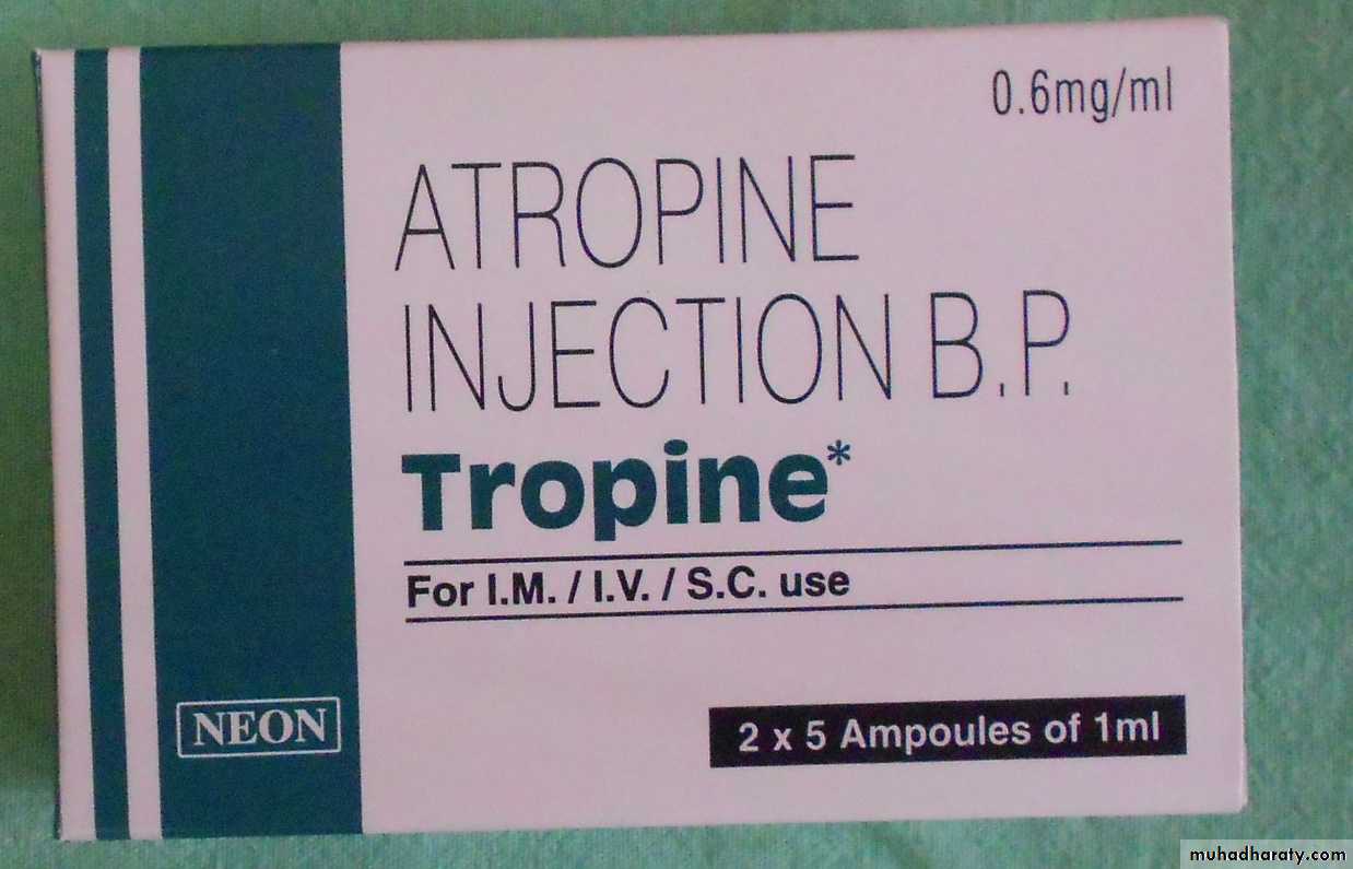 It is a parasympathetic blocking agent , it is recommended for the management of symptomatic bradycardiaAtropin acts to mantain adequate cardiac output & cerebral circulation . Large dose of atropine produce clinical signs of overdose which include hot dry skin , eadache , dry mouth , disorientation & hallucination . Atropine is contraindicated in glaucoma . It is available in 0.5 mg /ml in 1ml vial