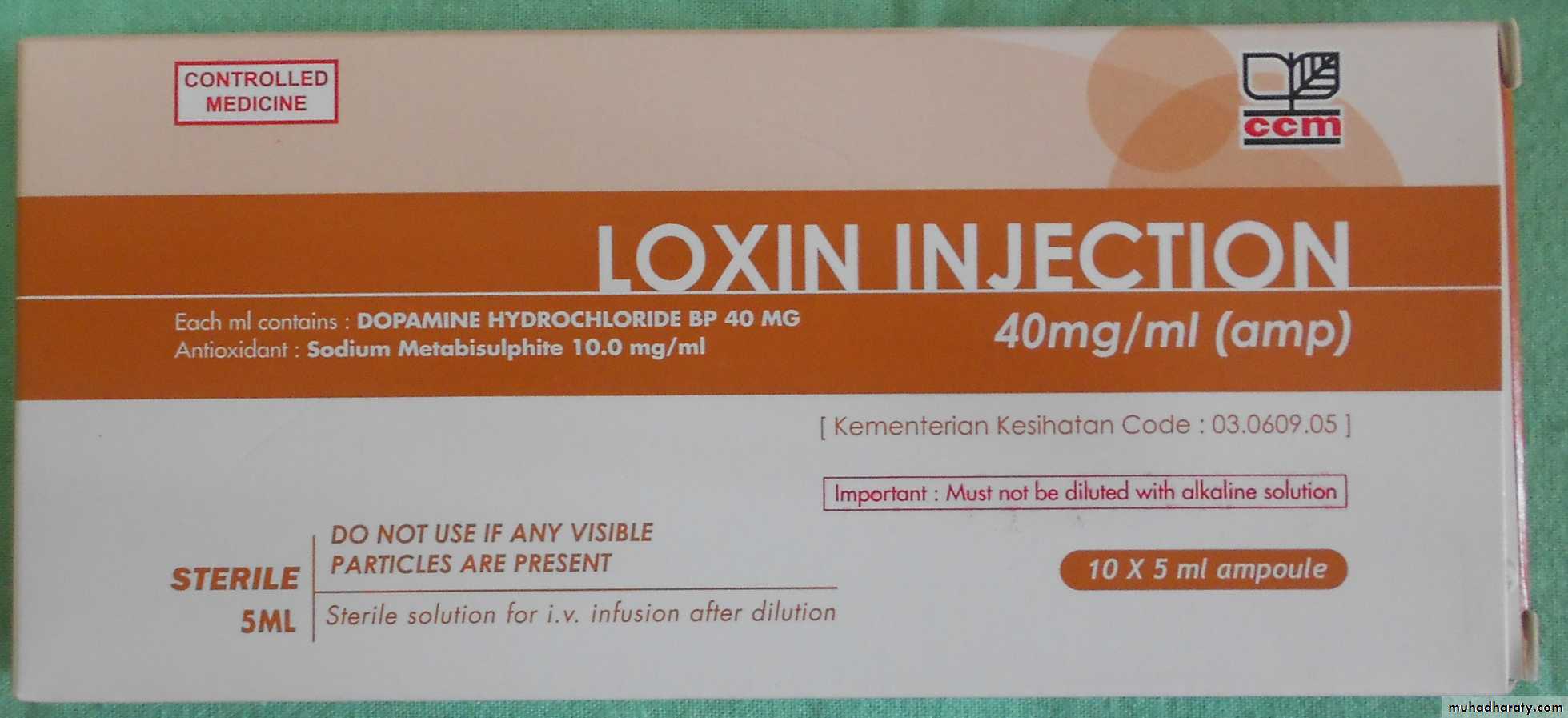 * Dopamine is a chemical precursor of norepinephrin . in large dose stimulate both the ( Alfa & Beta ) adrenergic receptor . At lower dose dilate renal , mesenteric & cerebral arteries . It is also indicated in hypotension in the absence of hypovolmia . It is available in 200mg ,400mg , 800mg in 5ml ampole