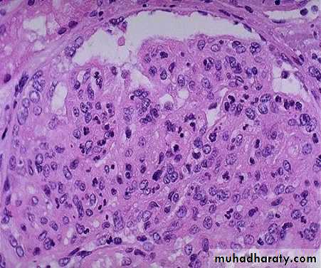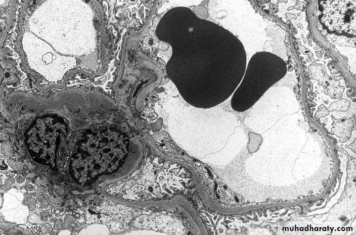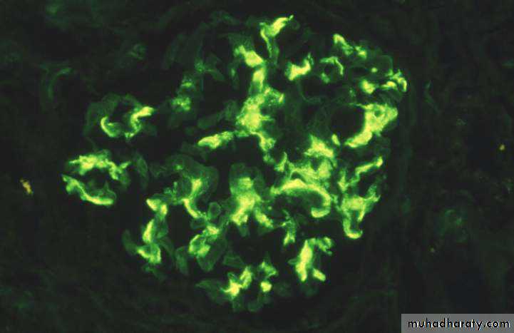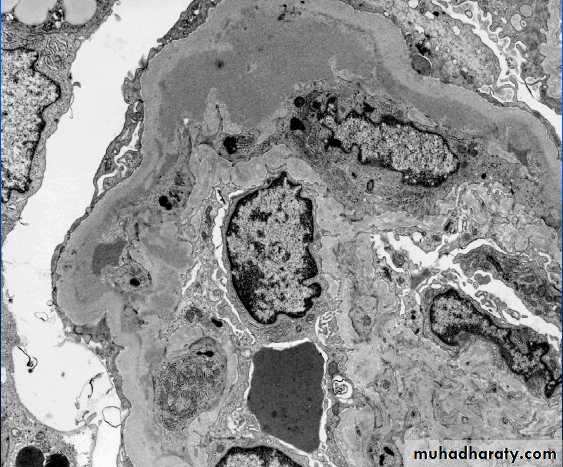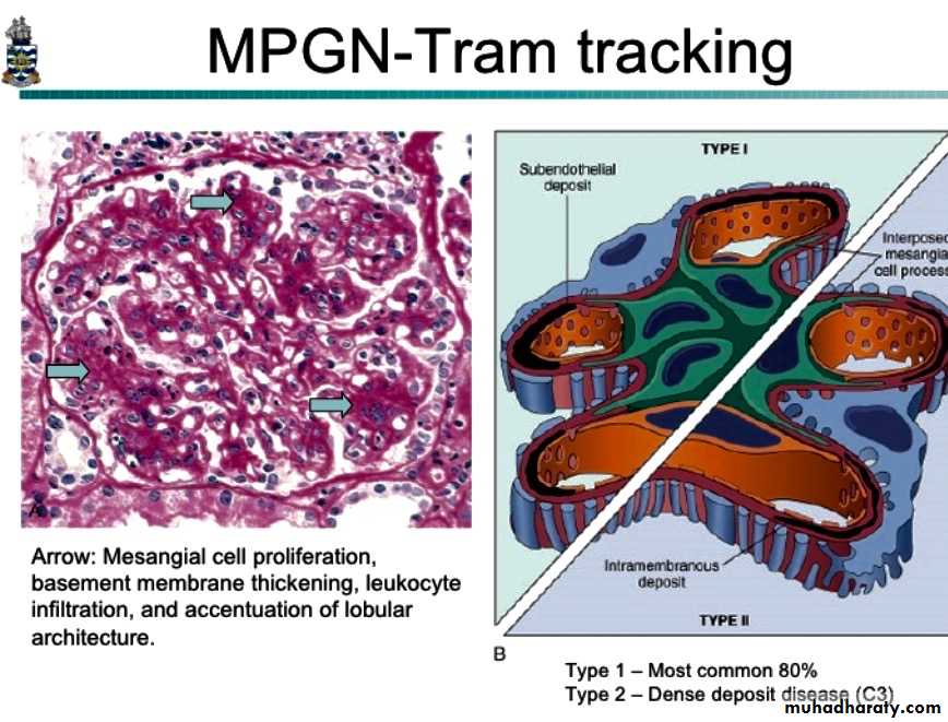 1.Type I (great majority of cases), is characterized by the presence of subendothelial electron-dense deposits. By the immunofuorescence, C3 is deposited in a granular pattern, and IgG and early complement components (C1q and C4) are often present, suggesting an immune complex pathogenesis.• Type II (dense-deposit disease), the GBM is transformed into an irregular, ribbon-like, extremely electron-dense structure, because of the deposition of dense material of unknown composition in the GBM proper. C3 is present in granular or linear pattern. IgG is usually absent, as are the early complement factors