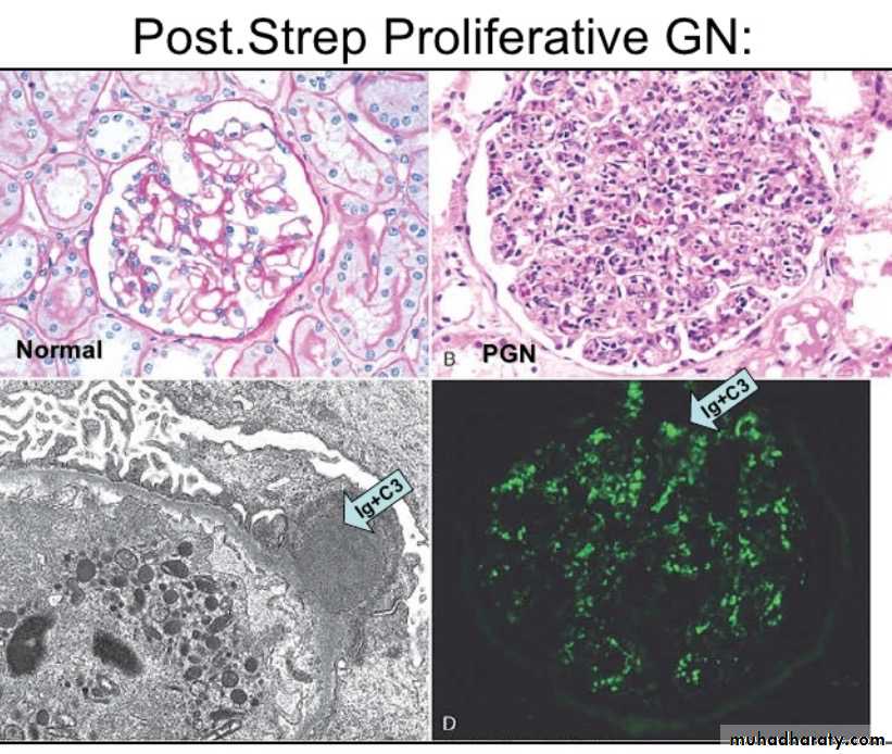 By light microscopy, the glomeruli are large due to hypercellularity secondary to proliferation of measngial cells, capillary endothelial cells and leukocytic infiltration.