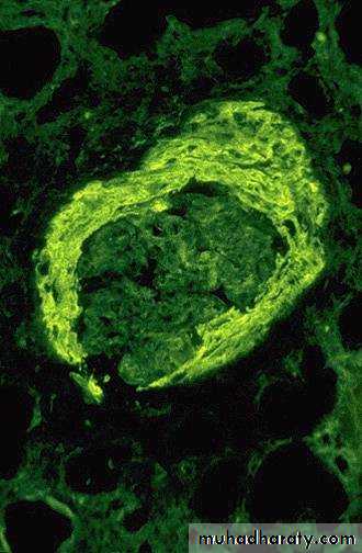 *Goodpasture Syndrome:characterized by linear IgG deposits along theGBM. In some of these individuals the anti-GBM antibodies also bind to pulmonary alveolar capillary basement membranes to produce the clinical picture of pulmonary hemorrhages associated with renal failure