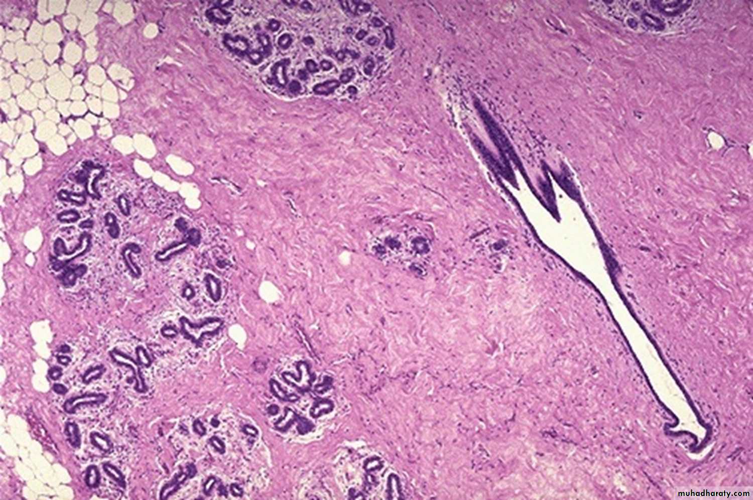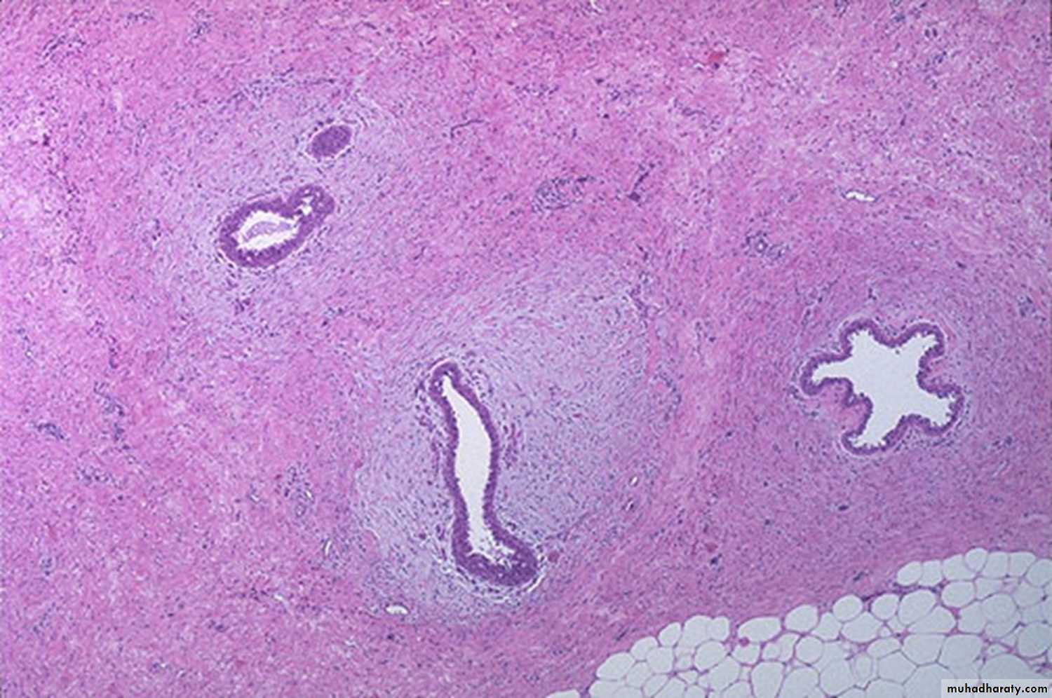 Fibrocystic disease: fibrosis, formation of cysts which are lined by flattened cuboidal epithelium, and adenosis.