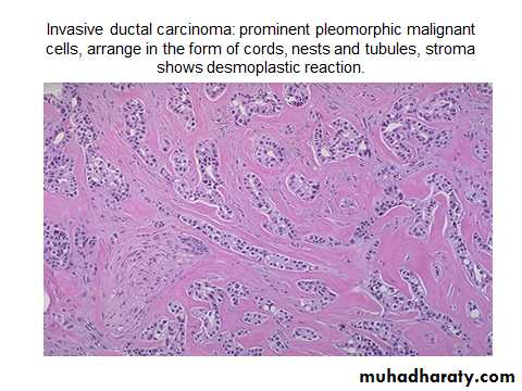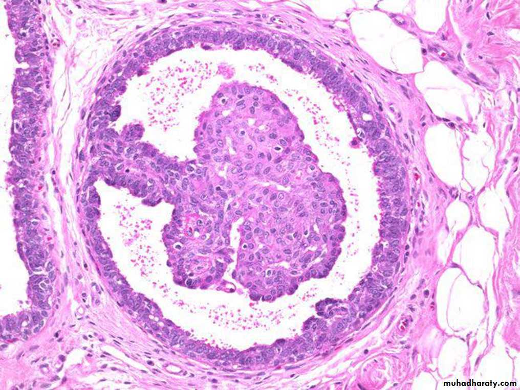 Mammary duct ectasia: irregularly dilated duct filled with lipid laden macrophages, with prominance of lymphocytes and plasma cells infiltration in periductal stroma.