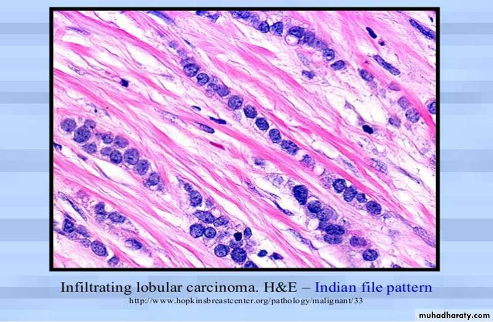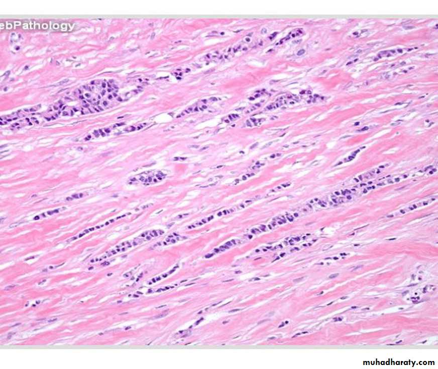 • Absence of solid, alveolar ,papillary, or gland forming units.• The tumor cells are arranged in slender linear strands.