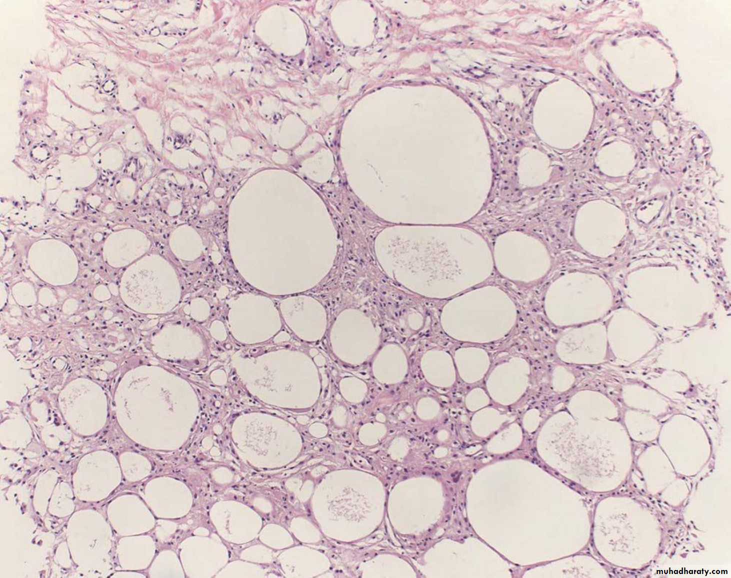 Traumatic fat necrosis of breast : lipid filled spaces surrounded by neutrophils, lymphocytes, plasma cells and lipid filled macrophages, enclosed by fibrous tissue. :