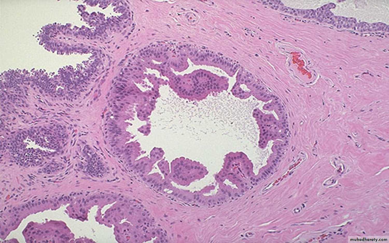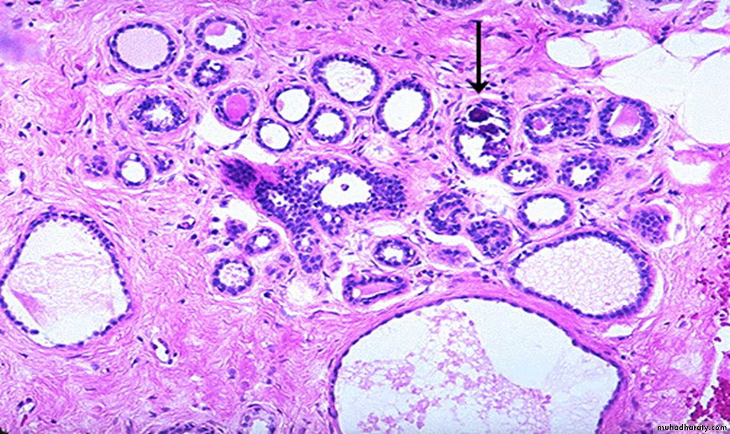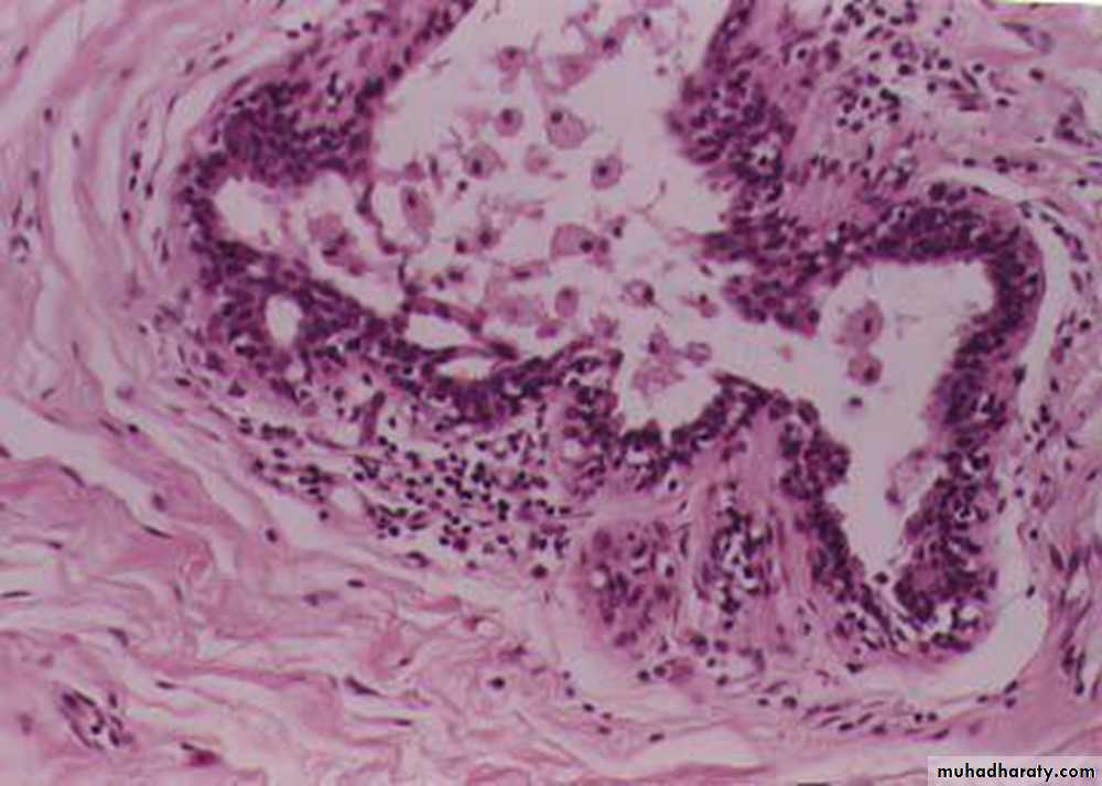 Fibrocystic disease: metaplasia of the lining epithelial cells which become large , columnar with Eosinophilic cytoplasm (apocrine metaplasia)