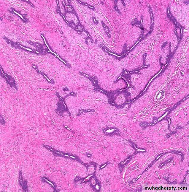 Intracanalicular fibroadenoma: stromal proliferation compresses the ducts which are irregular and reduced to slits.Duct papilloma: branching fibro vascular stromal core covered by cuboidal epithelium