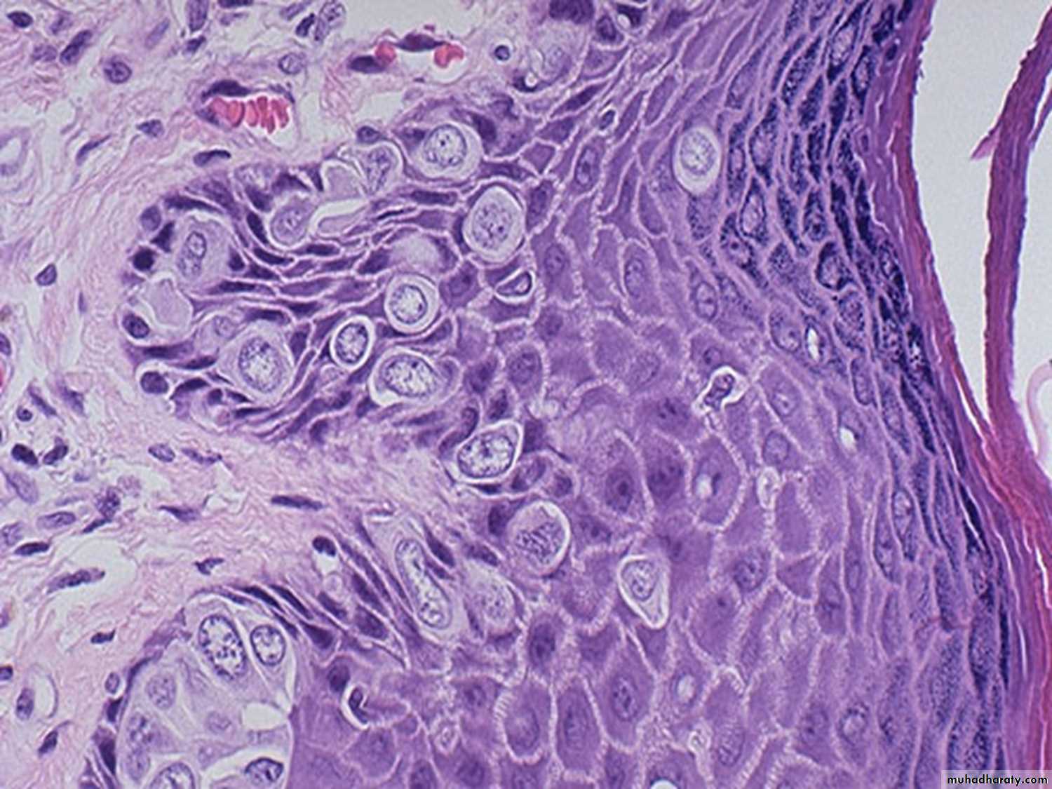 Paget disease of the breast: large cells with abundant clear cytoplasm and pleomorphic nuclei dot the epithelium