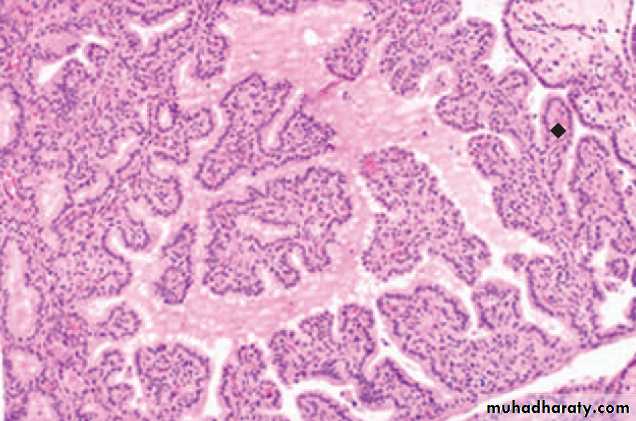 branching papillae which have fibrovascular stalk covered by single or multiple layer of cuboidal epithelium cells which range from well differentiated cells to anaplastic variety. some are composed predominantly or exclusively of follicles (follicular variants).• Dx. Is based on nuclear features: