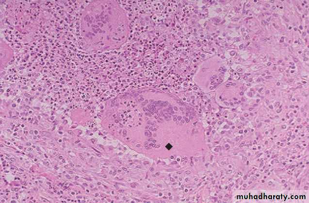 Specific granulomatous inflammation due to TB, sarcoidosis ,syphilis (gumma ) may occur