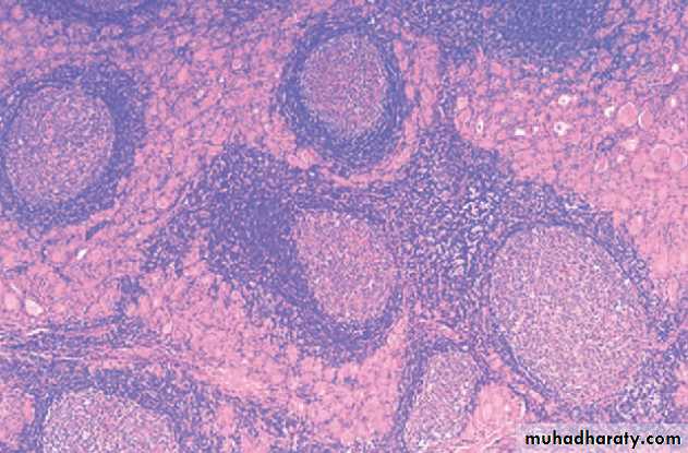 • Mononuclear (lymphoplasmacytic) infiltates with well-developed germinal centres.