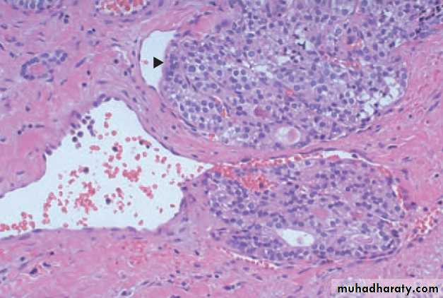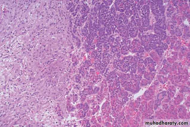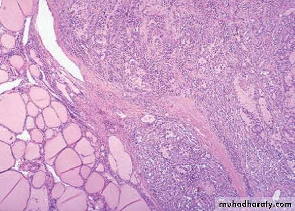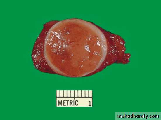 • Either well-circumscribed & even encapsulated, or infiltrative with ill-defined borders.