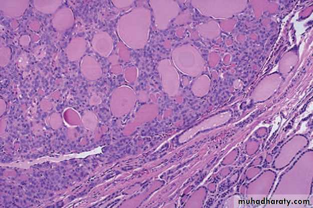 • Mic: tumor cells are arranged in uniform follicles that contain colloid, quite distinct from the adjacent non- neoplastic thyroid.