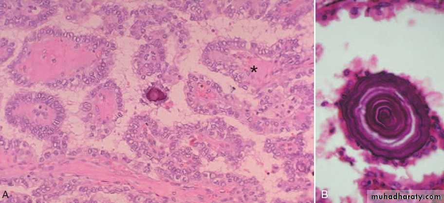 • Psammoma bodies (often): concentrically calcified structures .