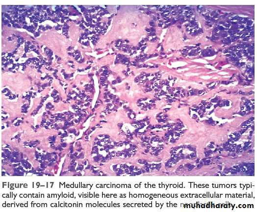 • Neuroendocrine neoplasm (Parafollicular cells).• 80% sporadic, 20% familial (MEN 2A or 2B).