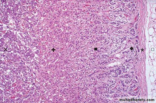 • Zona glomerulosa (narrow, beneath the capsule)• Zona fasciculata (75% of the cortex)