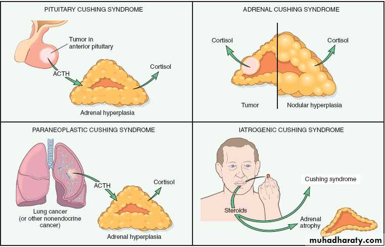 • Administration of exogenous corticosteroids (most cases)• Primary hypothalamic pituitary diseases, associated hypersec. of ACTH (~ half the cases)