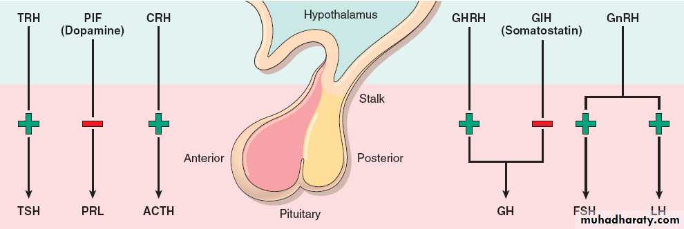 The release of trophic hormones is under the control of releasing or inhibiting factors produced in the hypothalamus.