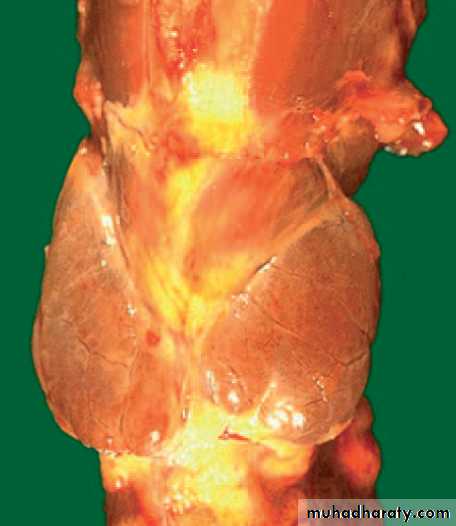 Pathology : The gland is swollen & congested with interstitial inflammation .