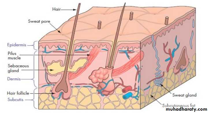 The epidermis is composed of keratinised, stratified, squamous epithelium and can be subdivided further into five layers: the stratum basale (deepest), the stratum spinosum, the stratum granulosum the stratum lucidum and the stratum corneum (superificial). It accounts for 5% of the total skin. The dermis constitutes 95% of the skin and is structurally divided into two layers. The superficial papillary layer is composed of delicate collagen and elastin fibres in ground substance, into which a capillary and lymphatic network ramifies . The deeper reticular layer is composed of coarse branching collagen, layered parallel to the skin surfaceAdnexal structures such as hair follicles and sebaceous and sweat glands span both the epidermal and dermal layers and contain some keratinocytesLipoma : Lipomas its the most common tumor in man. Lipoma it a dermal or subcutaneous collection of benign adipose tissue. Most lesion are solitary , discrete nodule that remain asymptomatic and occur commonly in trunk and extremities. Often the lesions may have a fibrous capsule that can surrounded the collection of adipose cells. Dercum syndrome : is a rare condition characterized by multiple, painful lipomas. These lipomas mainly occur on the trunk, the upper arms and upper legs. Treatment : usually removed for cosmetic reasons or on occasion pain, as a result of a neural or vascular component (angiolipoma) or when they compress an adjacent nerve.Large lipomas (>10cm) as well as deep-seated one Should arouse the suspicion of malignant change. The most frequent malignant counterpart is the liposarcoma