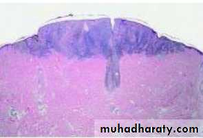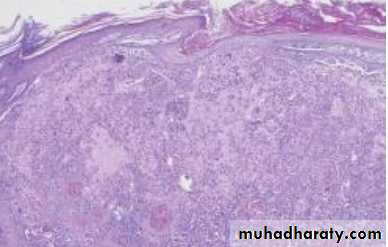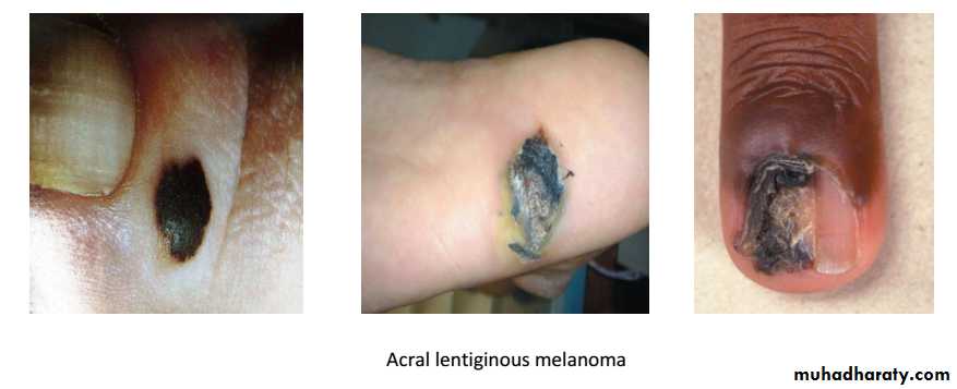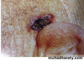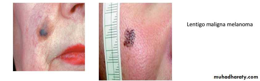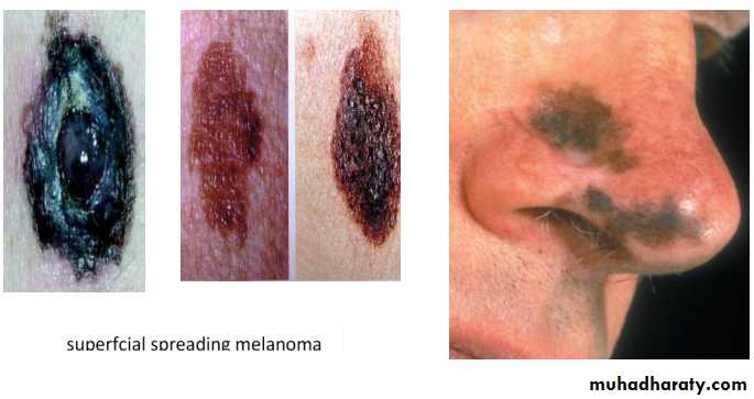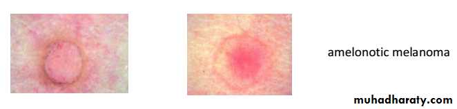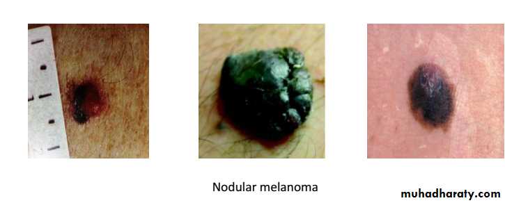 • Malignant melanoma : It is neoplasm of melanocyte which is neural crest derived cells that have differentiated toward melaoncytes.it occur in skin but can occur anywhere in body where the melanocyet are exist, such as bowel mucosa, retina…etc.Microscopic appearances : Atypical melanocyte invades from the dermis-epidermis junction down into the dermis.Clinical features : appeared as change in pre-existing naevus or as new lesion. Assess lesion for ABCDE :AsymmetryBorder irregularityColour change Diameter more than 6mmExtra features (itch,bleeding…. ).