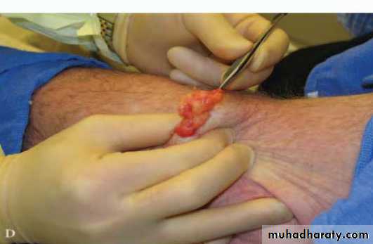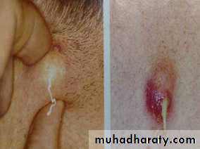 Sebaceous cyst (epidermal cyst) : Are the most common form of cysts, they can occur at any age and any body location except in the palm and soles. Most commonly , they occur in areas of increase pilosebaceous activity on the head and upper trunk. The lesion occur when The duct of sebaceous gland become blocked, it distended with its own secretion and ultimately become sebaceous cyst. It is firm swelling, adherent to skin and has punctum. It may get infection and ulceration. Complications : infection, ulceration, calcification, keratin horn and malignant change which is very rare Treatment : if infected treated by drainage the abscess and later on surgical excision