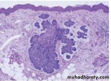 Basal cell carcinoma : It is the most common malignancy of whites. It arise from A-basal layer epithelial cells. B-external root sheath of hair follicle. It is slowly growing tumor, it doesn’t metastasize but can infiltrate the adjacent tisssues. commonly found in face above line drawn from angle of mouth to lobe of ear. It could occur anywhere, but particularly in the skin of scalp, face, arm and hands i.e sun exposed area. Microscopic appearance : Characteristic finding is of ovoid cells in nest with a single outer (palisading) layer.